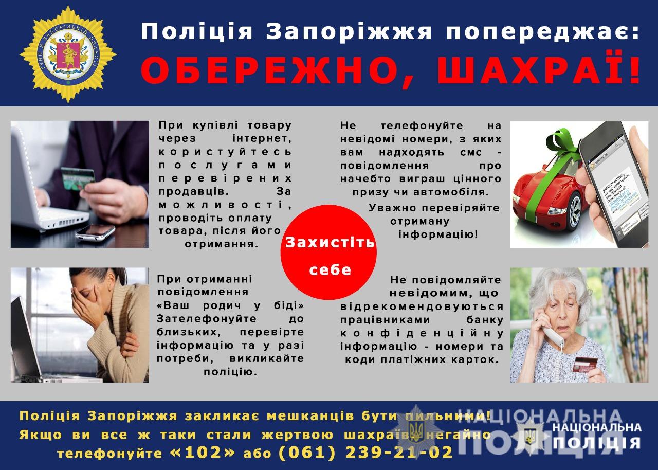 Ліцей №9 сприяє та підтримує ініціативи Поліції Запорізької області, спрямовані на активізацію протидії шахрайству. Поліція проводить профілактичні бесіди, розповсюджує інформаційні листівки, здійснює заходи з викриття діяльності шахрайських call-центрів, а також роз’яснює громадянам правила особистої безпеки.